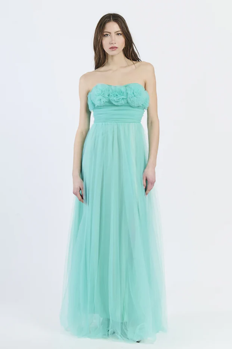 “Hydrangea” Dress – Long Floral Dress with Off-the-Shoulder Sleeves and Romantic Ruffles